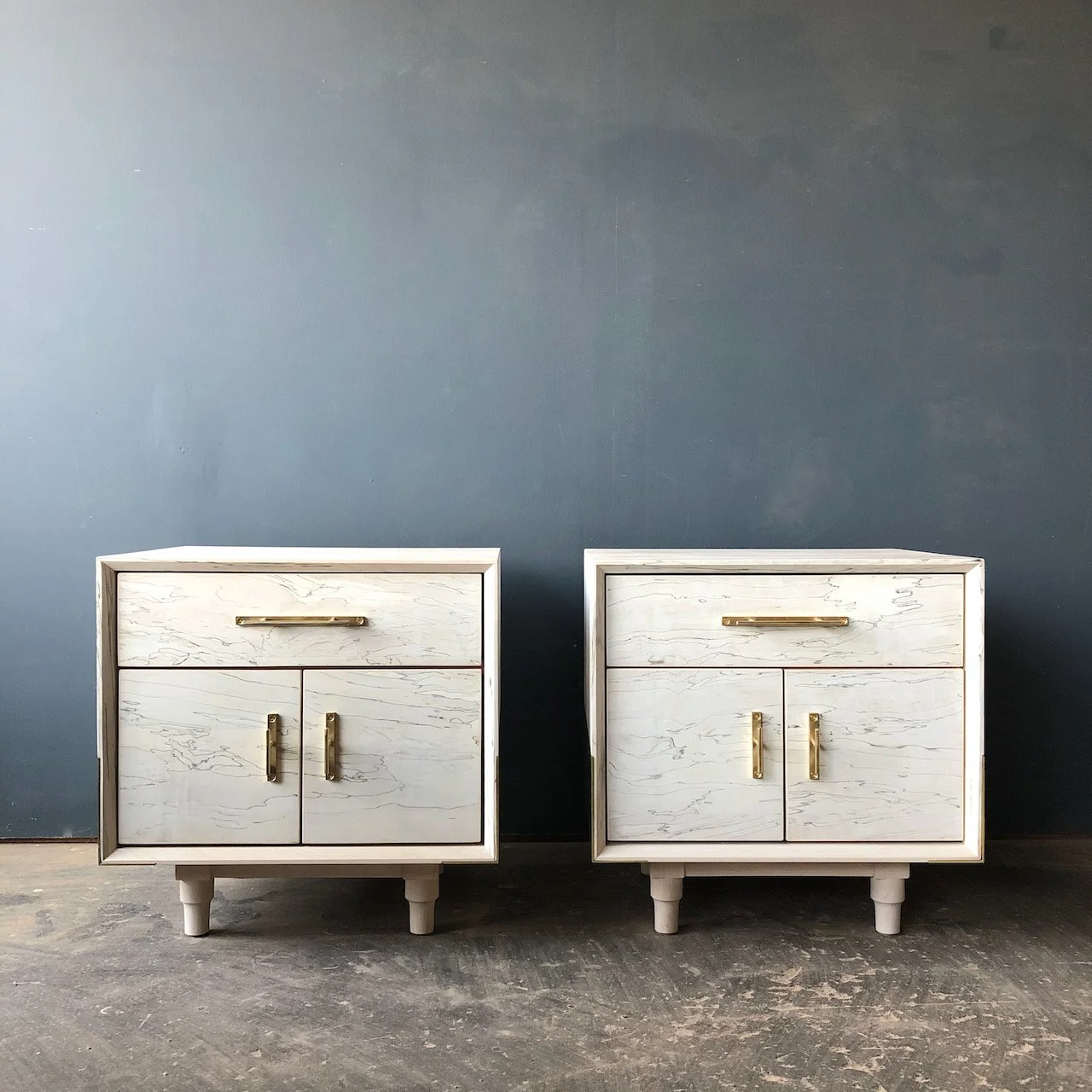 Versatile nightstand, shown here in spalted maple with matte black hardware. handmade in the Hudson Valley.